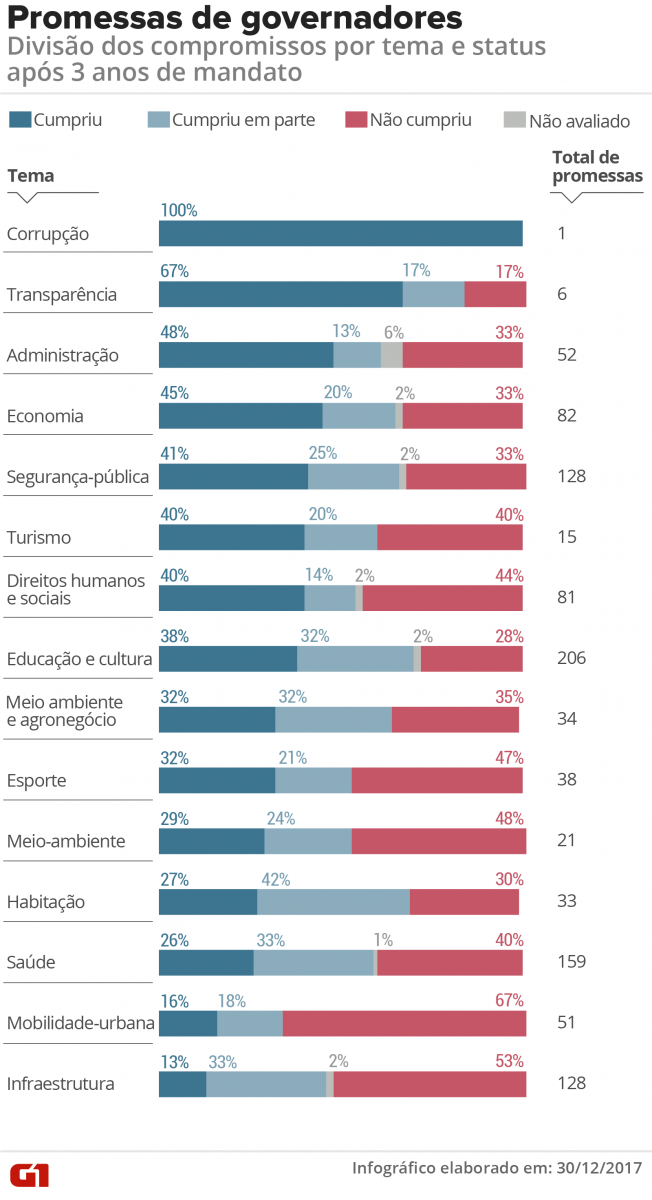 Levantamento do G1 mostra que outros 26% das promessas feitas antes da eleição foram cumpridas parcialmente; já as que ainda